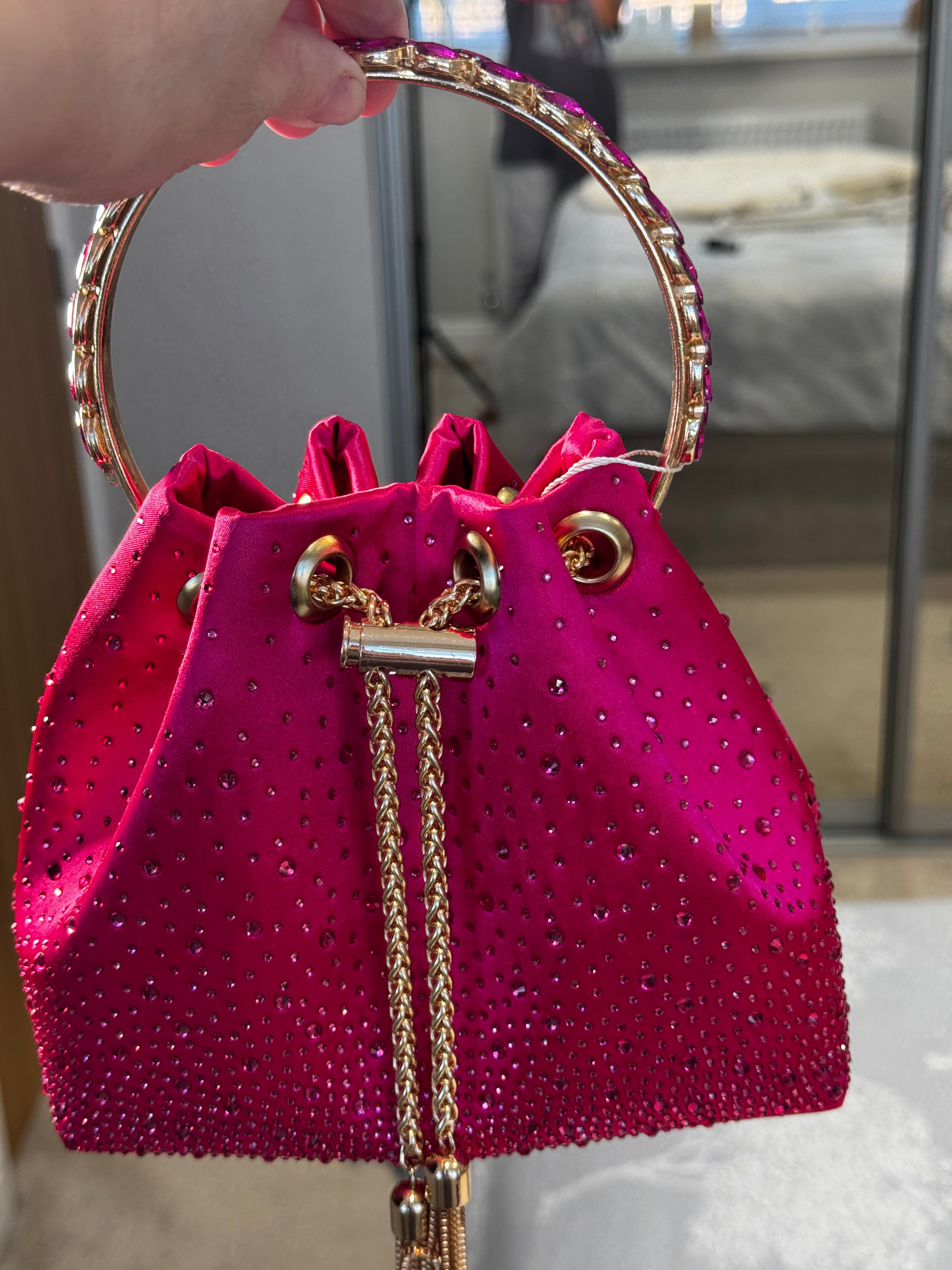 Elevate your style with our Top Handle Diamond Pouch. This sleek pouch features a stunning diamond embellishment, along with a top ring handle for easy carrying. It also includes a convenient cross body chain for hands-free use. Perfect for adding a touch of luxury to any outfit.